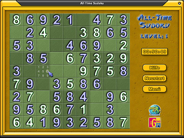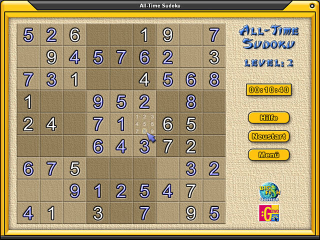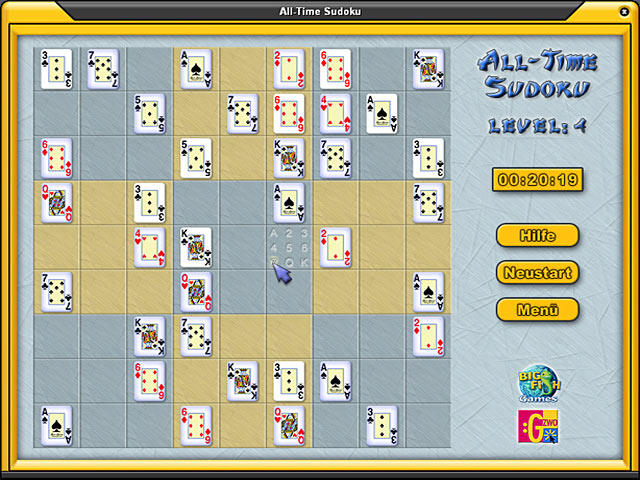 All-Time Sudoku ist eine weitere Version des klassischen Sudoku, dass sich zur Zeit zu einem der beliebtesten Denkspiele entwickelt. Gespielt wird auf einem 9 x 9 Felder großen Zahlenbrett in dem bereits einige Zahlen vorgegeben sind. Ziel bei All-Time Sudoku ist es, die freien Felder so mit Zahlen auszufüllen, dass in jeder der Zeilen, Spalten und Quadrate, die Zahlen von 1 bis 9 nur einmal vorkommen. Neben Zahlen, kann auch mit Spielkarten sowie mit Farbsymbolen gespielt werden. Wenn du Rätsel lieber auf Papier lösen möchtest, kannst du diese auch ausdrucken. Optional auch gleich mit Lösung. - All-Time Sudoku