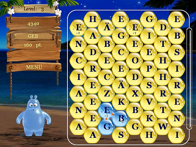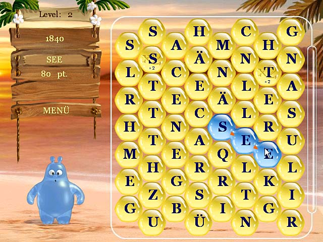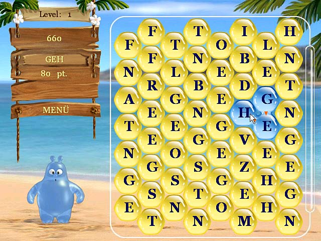 Willkommen in der Welt von „Aqua Words“. Hilf Aquatic, dem netten Helden des Spiels, aus den zufällig herabfallenden Buchstabenblasen möglichst lange Wörter zu formen, indem Du nebeneinanderliegende Buchstaben verbindest. Je länger das gebildete Wort ist, desto größer ist Dein Bonus. Mit drei verschiedenen Schwierigkeitsgraden bietet „Aqua Words“ Spielspaß für die ganze Familie! - Aqua Words