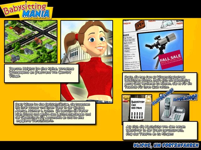 Du hast Deinen Babysittingkurs bestanden und jetzt bist Du bereit, Geld für Deine Schule aufzubringen. Um Dein Ziel zu erreichen, musst Du Dich mit den wahnsinnigsten Haushalten auseinandersetzen. Babysitting Mania fängt langsam an, aber bald wirst Du mit anspruchsvollen Kindern, Geburtstagspartys und riesigen Häusern konfrontiert. Bringe die Kinder ins Bett und räume das Haus auf, bevor die Eltern nach Hause kommen. Bist Du ein super Babysitter? - Babysitting Mania