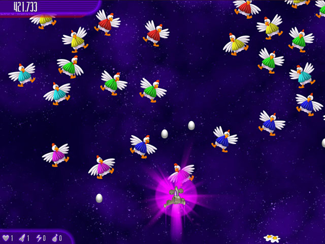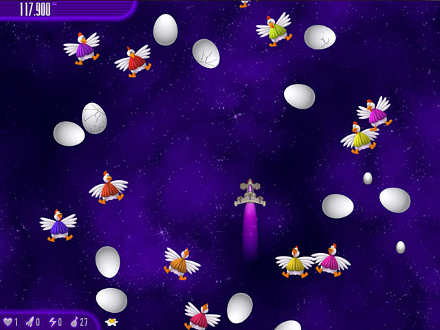Vernichte intergalaktische Hühner, die die Menschheit für die Unterdrückung ihrer irdischen Artgenossen bestrafen wollen! Weiche fallenden Eiern aus, sammle Raketen, verschieße grillende Laserstrahlen und rüste dein Raumschiff auf! Rette die Erde vor dem Eierwahn! Der Abschuss der Tiere bringt ebenso Punkte, wie das Sammeln der herabfallenden Hähnchen-Schenkel, Braten und Geschenke. Vorsicht ist dagegen bei den explosiven Eiern geboten. - Chicken Invaders 4: Ultimate Omelette