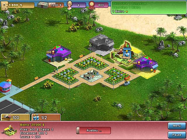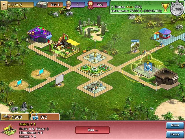 Gestalte in „Das Strandimperium“ ein erstklassiges Urlaubsziel! Starte mit ein paar Bungalows und einem Restaurant. Erbaue dann Kinos, Tanzclubs, Swimmingpools und vieles mehr, um Deine Gäste bei Laune zu halten. Nutze Deine Gegen-die-Zeit-Fähigkeiten, um clevere Entscheidungen bezüglich Deiner Arbeiter und Vorräte zu treffen. Werte Deine Gebäude auf, um noch mehr Geld einzunehmen und benutze Marketing, damit Deine Ferienanlage die beste ist! - Das Strandimperium