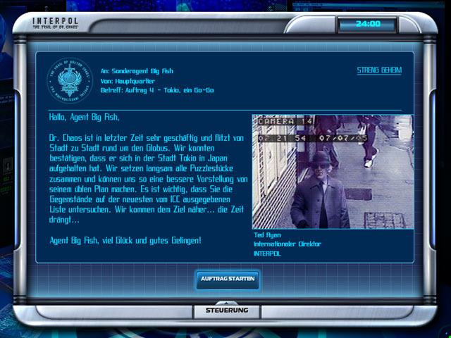 Ein mysteriöser und gefährlicher Verbrecher, der seit über einem Jahrzehnt untergetaucht gewesen sein soll, ist plötzlich wieder aufgetaucht. Die Behörden haben seit dem Kalten Krieg versucht, ihn aufzuspüren und es ist jetzt an der Zeit, ihn festzunehmen. Dein Auftrag bei diesem einzigartigen Wimmelbildspiel besteht darin Dr. Vladimir Chaosky, auch bekannt als Dr. Chaos, mittels weltweiter Ermittlungsarbeit endlich zur Strecke zu bringen. Reise nach Tokio, New York, Moskau, etc. und finde die verstecken Gegenstände, die zum Täter führen. Die Welt braucht Deine Hilfe! - Interpol: The Trail of Dr. Chaos