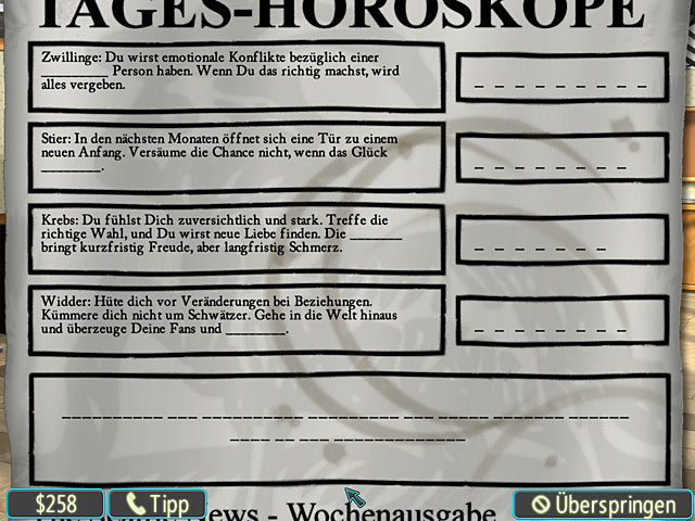 In “Mae Q'west and the Sign of the Stars” ist es an Dir, die Sterne zu deuten und das Rätsel um das Verschwinden von Maes Ehemann aufzuklären. Maes Horoskop leitet sie auf ihrer epischen Reise auf der Suche nach ihrem Mann, der auf dem Meer verschollen ist. Kannst Du Deine Detektivfähigkeiten nutzen und Mae helfen, ihre Familie zusammenzuführen? - Mae Q`West and the Sign of the Stars