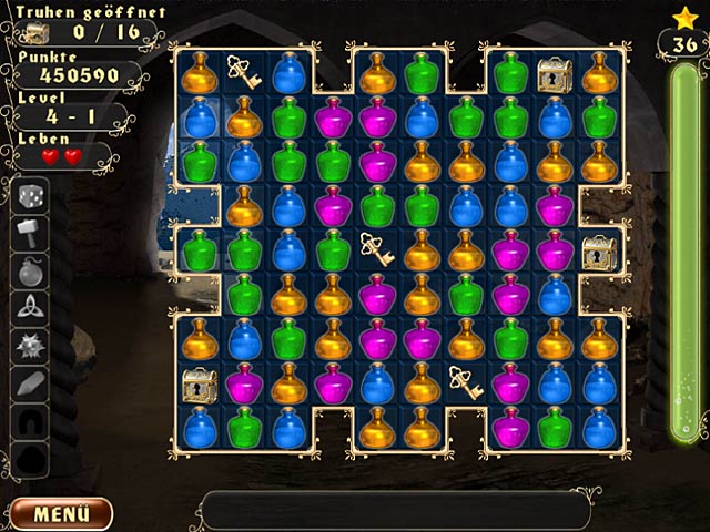 Reihe gleichfarbige Objekte aneinander, um Schatztruhen mit goldenen Schlüsseln zu verbinden. Wenn alle Truhen aufgeschlossen sind, ist das Level gewonnen und Du wirst mit einem beliebten Märchen belohnt. Sammle Sterne um Upgrades und Bonusse, z.B. Chaos oder einen Hammer. Nutze Strategie um die Truhen aufzuschliessen, aber vergiss nicht, auf die Zeit zu achten! - Magic Tale