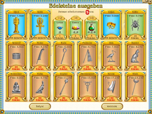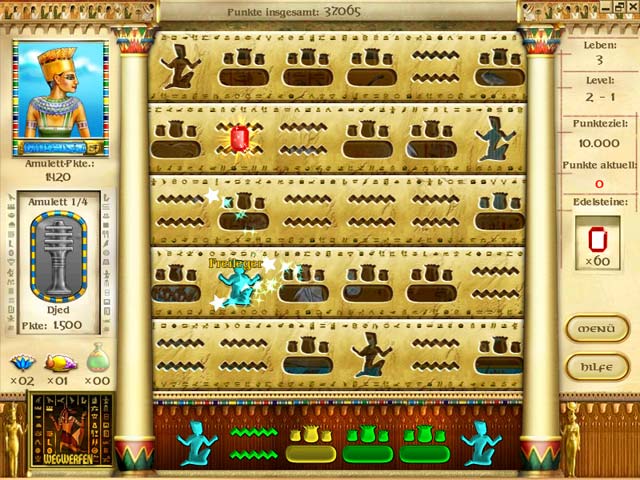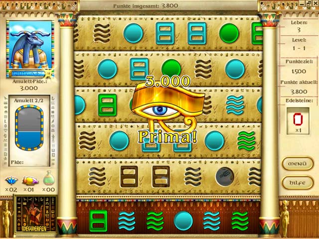 Die Goetter der aegyptischen Unterwelt freuen sich, wenn Du Edelsteine fr sie sammelst. Denke gut nach und platziere die bunten Symbole so schnell Du kannst in den durchlaufenden Reihen. In 100 anspruchsvollen Levels koennen Raetselfans durch strategisches Denken glitzernde Amulette und Edelsteine ergattern. - Mysteries of Horus
