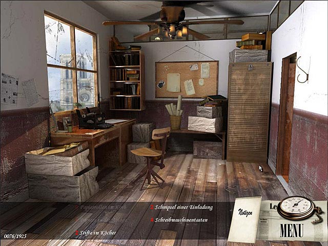 Journalist Edgar Lance stolpert in dem Wimmelbildabenteuer „Paris 1925“ bei der Recherche zu seinem ersten Artikel über einen mysteriösen Mordfall. Jage durch Paris der Goldenen Zwanziger Jahre vom Arc de Triomphe bis zum Eiffelturm und kläre die Verschwörung einer geheimnisvollen Gestalt auf. Werden Deine Ermittlungen Schlagzeilen machen? Finde es jetzt heraus! - Paris 1925