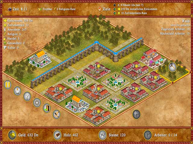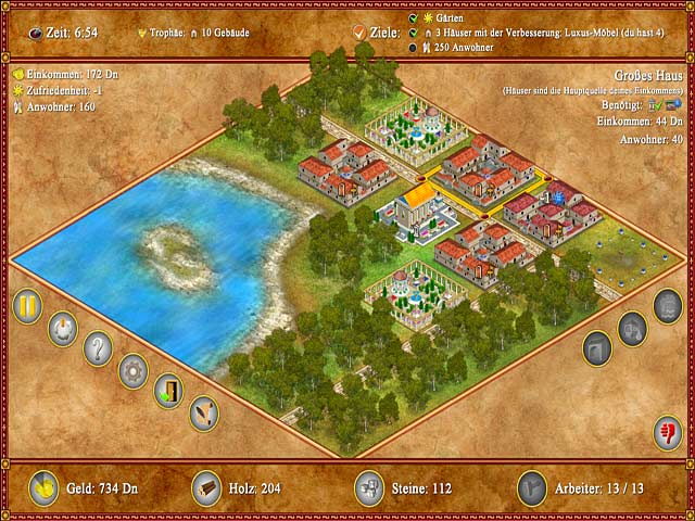 In diesem Strategiespiel wirst Du zum römischen Eroberer! Mit seinem fesselnden Spielspass und farbenfrohen Grafiken lässt „Romopolis“ keine Wünsche offen. Errichte quirlige antike römische Städte und sorge dafür, dass Deine Einwohner zufrieden sind, indem Du sie mit all den Annehmlichkeiten versorgst, die sie für wichtig erachten. Verbessere die Gebäude und eröffne neue öffentliche Einrichtungen für Deine Bewohner. Sorge dafür, dass das Volk glücklich ist, und Du wirst mit viel Geld, Ruhm und Ehre belohnt werden. - Romopolis