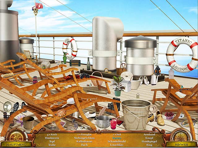 Begib Dich zusammen mit Eva und ihrer Familie in dem fesselnden Wimmelbildabenteuer „Secrets of the Titanic 1912-2012“ auf eine Kreuzfahrt, die derselben Route folgt wie einst die berühmte Titanic. Nachdem sie die Halskette ihrer Großmutter anlegt, sieht Eva Erinnerungen und befindet sich bald selbst in Gestalt ihrer geliebten Großmutter an Bord der Titanic. Soll sie versuchen, die Geschichte zu ändern und den schrecklichen Unfall zu vereiteln? Setze Deine Wimmelbild- und Logikfähigkeiten ein und finde es jetzt heraus! - Secrets of the Titanic 1912-2012