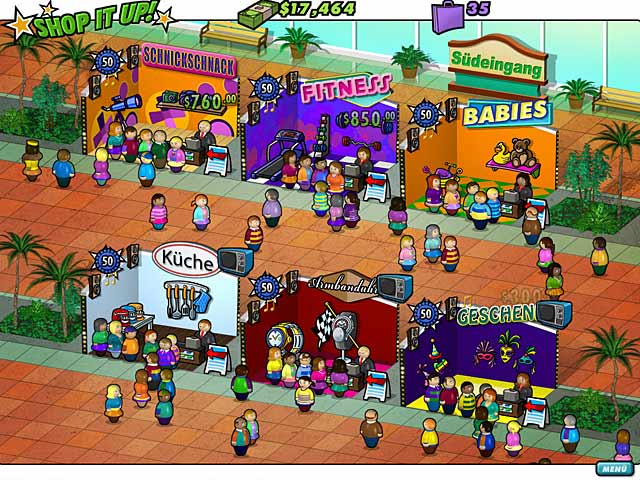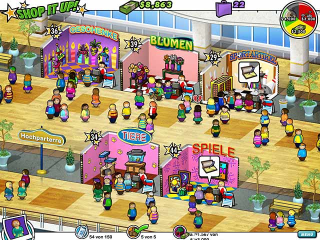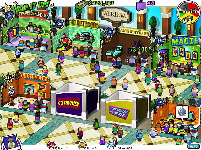 Am Tag der großen Eröffnung des Einkaufszentrums sind die Kunden bereits drin, aber das Zentrum noch nicht fertig! Deine Fähigkeiten sind gefragt, um neue Geschäfte zu eröffnen und zu dekorieren. Lasse die Verkaufszahlen mit atemberaubenden Auslagen und exzellenter Werbung in die Höhe schnellen! Stelle Assistenten und Kassierer ein, sobald Dein Einkaufszentrum richtig aufblüht, und hilf allen Kunden in „Shop it Up!“, einem großartigen Gegen-die-Zeit-Spiel. - Shop It Up!