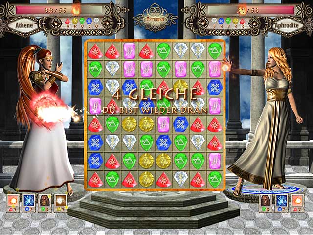 Zeus, der König der Götter, hat in „Throne of Olympus“ beschlossen, sich zur Ruhe zu setzen. Wer soll sein Nachfolger auf dem Thron werden? Nach reiflicher Überlegung hat er sich für seine Tochter Athene entschieden. Diese Wahl finden die anderen Götter allerdings alles andere als gelungen. Athene soll ihre Würde in Wettstreits beweisen! Kannst Du Athene in diesem rasanten 3-Gewinnt-Spiel helfen, sich gegen die anderen Götter durchzusetzen? - Throne of Olympus