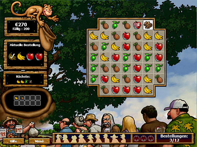 Gegenüber von Tinos Obststand wurde ein großer, unpersönlicher MegaMart eröffnet. Jetzt fürchtet Tino, dass er sein kleines Familienunternehmen schließen muss! Aber zum Glück gibt es Rikki, den flinken Affen. Er packt das Obst ein. Deine Aufgabe besteht darin, ihm mit den Bestellungen der Kunden zu helfen, damit diese zufrieden sind. Erledige die Bestellungen und hole dir Bonuspunkte. Aber werde bloß nicht langsamer, und lass das Obst nicht zu lange herumliegen. Ansonsten werden die Kunden unzufrieden, und das Familienunternehmen kann dichtmachen. Wenn du die Powerups klug einsetzt und die richtigen Entscheidungen triffst, dann erntest du mehr als nur Obst - du baust ein Handelsimperium auf! - Tino's Fruit Stand