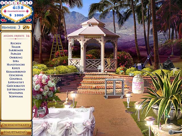 Mit einem luxoriösen Las Vegas Resort im Hintergrund ist es in „Traumhochzeit Las Vegas“ Deine Aufgabe, eine perfekte Hochzeit für ein anspruchsvolles Paar zu planen. Durchsuche tolle Wimmelbildszenen, um die perfekten Objekte für die Hochzeit zu finden und verhindere verschiedene Hochzeitskrisen! Verdiene Extrapunkte um extravagante Dekoartikel zu kaufen, exklusive Hochzeits-Accessoires zu entwerfen und tolle Flitterwochen zu planen. Hol Dir den Jackpot! - Traumhochzeit Las Vegas