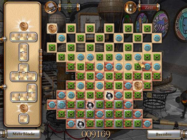 Zodiac Tower - Bei Zodiac Tower musst Du, mit zufälligen Teilen, die belegten Felder auf dem Spielfeld abdecken und diese so vom Spielfeld entfernen. Die Teile erinnern an Tetris-Teile und können gedreht werden. Die einzige Bedingung für die Plazierung ist, daß die darunter liegenden Steine das gleiche Motiv haben müssen. So wird das Spiel natürlich immer schwerer. Es gibt drei verschiedene Spielvarianten. - Zodiac Tower