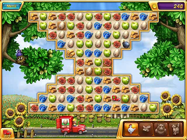 Schlüpfe in Deinen Overall und ernte was das Zeug hält in diesem mitreißendem 3-Gewinnt-Spiel! Klicke und ziehe Feldfrüchte, um Paare zu erstellen, befülle Lieferwagen mit Ernte, bevor es zu spät ist und gestalte Deine Farm mit großartigen Aufwertungen. Kaufe Tiere, um bei Deinen Aufgaben mit anzupacken, gewinne dank Boni und verdiene Trophäen für atemberaubende Gegenstände, während Du durch 100 wunderschöne Level pflügst. Du wirst Deinen Augen nicht trauen, wenn Du in Erntezeit“ ein Stück Dürrland in den schönsten Fleck Erde verwandelst! - Erntezeit