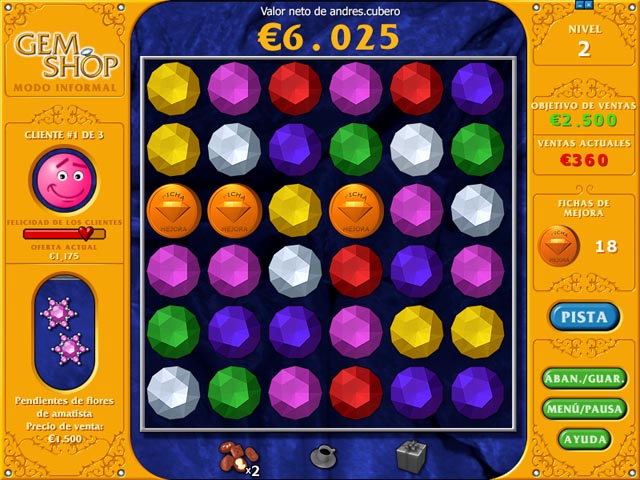 ¡Combina gemas de colores y ten a tus clientes satisfechos! ¡Vende piedras preciosas y joyas a tus felices clientes, pero cuidado! Hazles esperar mucho y se quejarán. ¡Tendrás que ofrecerles buenos regalos para tenerles contentos (y hacerte con la venta)! Recuerda: ¡Clientes satisfechos gastán más y hacen de tu tienda un buen negocio! - Gem Shop