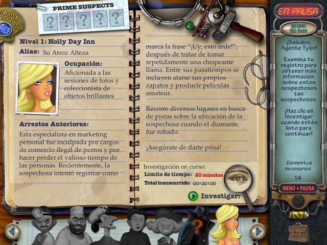 El Diamante Esperanza de la Reina ha sido robado. Está en tus manos encontrar al culpable del delito. A lo largo de 22 niveles deberás encontrar las pistas necesarias para dar con el ladrón. Visita 29 insólitos lugares en busca de objetos para ir avanzando en tu investigación. Miles de pistas se ocultan en este juego. ¡Cada vez que juegues nuevas pistas y nuevos retos te esperan en esta obra maestra detectivesca! - Mystery Case Files: Prime Suspects