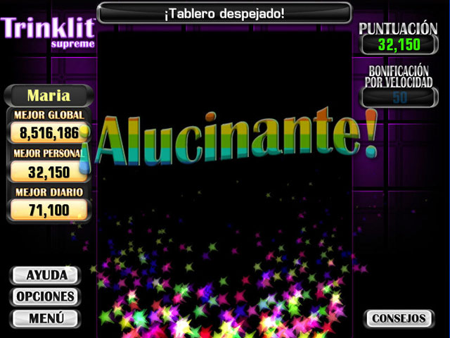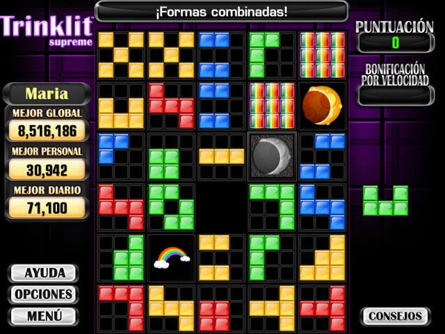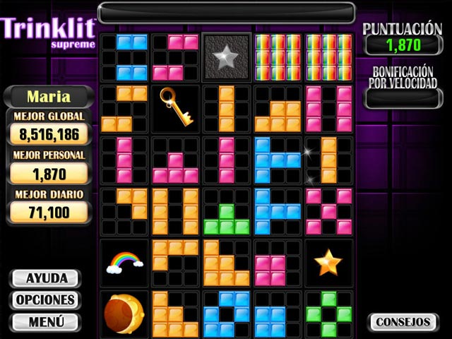 ¡Sumérgete en un divertido juego de puzle en Trinklit! Aparentemente simple, pero difícil de dominar, Trinklit es una aventura emocionante. Comienza con un simple juego y luego intenta desbloquear potenciadores y modos de juego a medida que avanzas y combinas las piezas en una infinita variedad. ¡Crea niveles nuevos y desbloquea todos los premios a medida que avanzas! - Trinklit Supreme