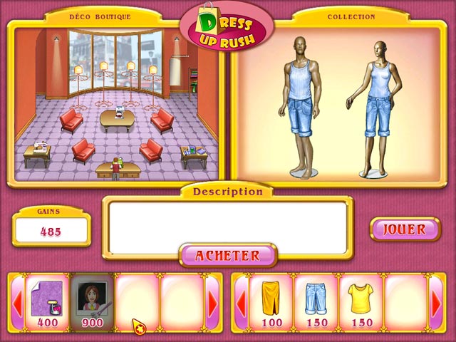 Jane a un rêve : ouvrir sa propre boutique de vêtements et imposer son style ! Après avoir conclu un contrat et décidé d'ouvrir sa boutique en plein centre-ville, Jane a du pain sur la planche ! Ornez votre magasin des plus belles pièces de couture, aidez vos clients dans leurs choix, encaissez, entretenez votre boutique et améliorez votre point de vente pour réussir le challenge ! - Dress Up Rush