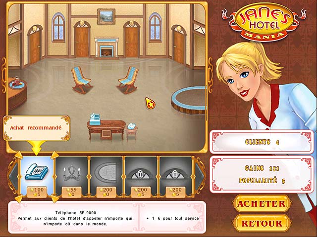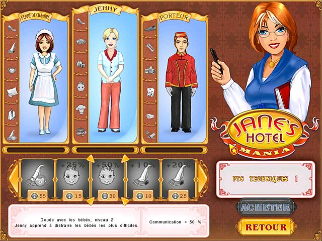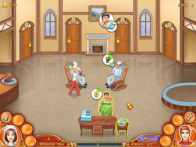 Transformez de simples hôtels en véritables palaces, restez à l'écoute de vos clients et exercez vos talents dans 4 contextes culturels différents ! Faites preuve d'observation, gérez habilement vos employés et vous deviendrez bientôt une directrice d'hôtel respectée et admirée. Prenez soin de vos clients, des femmes avec enfants, des marins ou des lords, sans oublier les dames qui ont toujours faim dans Jane's Hotel Mania ! - Jane's Hotel Mania