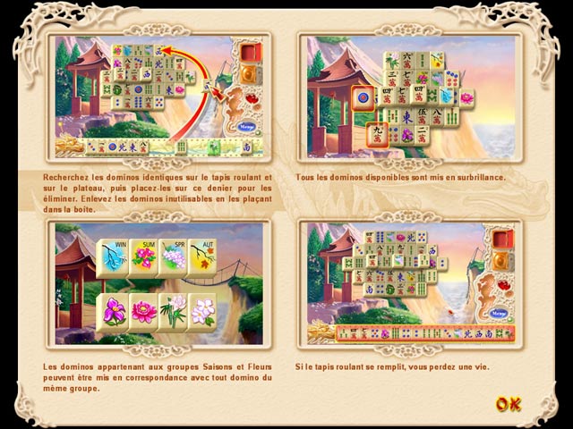 Mahjong Match représente la parfaite combinaison entre un jeu de puzzle et un jeu de mahjong classique. Laissez-vous emporter par la musique douce et les paysages magnifiques mais faites preuve de rapidité afin de glisser les tuiles jusqu’à leur double au-dessus du tapis roulant. Si vous êtes trop lent, les tuiles s’empilent et le jeu est terminé. - Mahjong Match