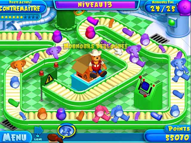 Essayez vos talents dans une usine ! Dans le milieu de requins qu’est l’industrie du jouet, vous aurez pour tâche de regrouper des objets et viser avec précision, le tout en recevant constamment des ordres. Jusqu’où irez-vous dans la hiérarchie de l’entreprise Teddy Factory ? Obtiendrez-vous la promotion que vous voulez ? Pourrez-vous travailler sur des jouets plus gros et plus performants ? Dans des usines plus importantes ? A vous de le découvrir ! - Teddy Factory