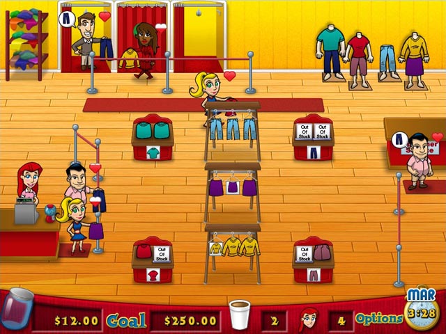 Francie just got a new job at the Uber-Mart... as their only employee! It`s up to you to help her run this fast-paced clothing store. Fitting rooms will need to be cleaned, tables will need to be stocked, and customers will need to be helped. Complete the first year at Uber-Mart and then help Francie open up her own line of clothing stores! Spruce up your store with fancier clothes and trendy new upgrades. It`s up to you to set the fashion trends! - Fashion Fits!
