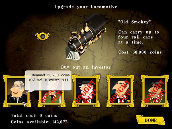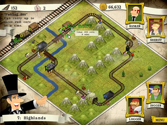 In Loco Mogul you play a seasoned railroader turned entrepreneur as you attempt to build a railroad empire. Search for hidden towns, mines and other customers in your territory then build a fully functional railroad, complete with train stations, junctions, bridges, and mountain tunnels. After you`ve built your railroad lines you get to run your trains and maximize profits by delivering materials to their destinations before your fuel runs out. - Loco Mogul