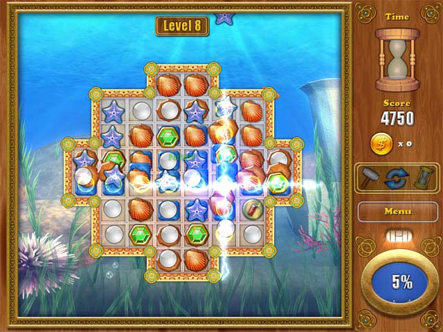 Step onboard the big submarine and wander the ocean. Collect treasures and coins to destroy matching groups of three or more objects. Be proactive and acquire power-ups like Bomb, Goldfish, and Lightning to improve your score. As a bonus, there`s a brave captain to help you navigate the game. Explore the depths of the ocean in Oceanix, a subterranean match game. - OceaniX