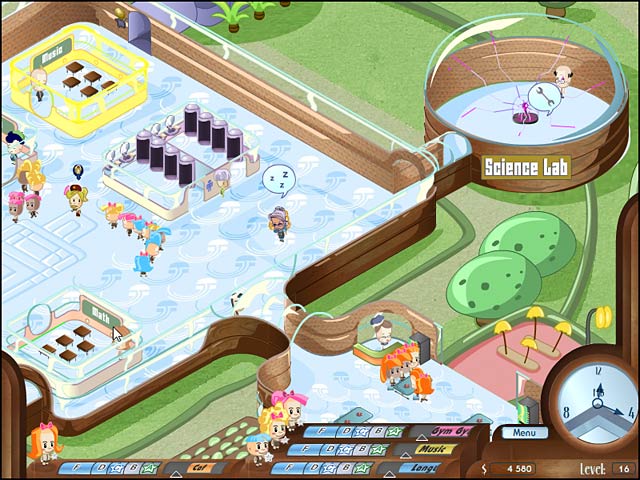 After getting her Super Master`s degree, Victoria Bright set out to build a school for the talented and gifted. Now established, aid Principal Bright in her quest to cultivate and educate her budding geniuses. Sheppard students through their days at Brainiac Elementary and maximize their learning potential. Grow your school, staff, and its offerings as your Jr. Einsteins mature. From potty breaks to hallway monitoring, it`s one funky School House Shuffle. - School House Shuffle