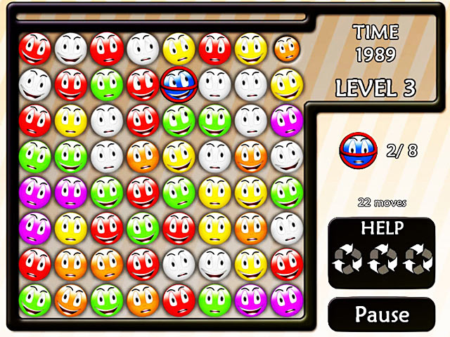 You won't be able to stop smiling at this bright and cheery puzzle game. Line up three or more Smileys of the same color, and watch them disappear. Progress through levels by clearing a set number colored Smileys from the board. Try Challenge mode for some extra tricky tasks! Let these Smileys make your day! - Smileys