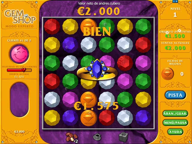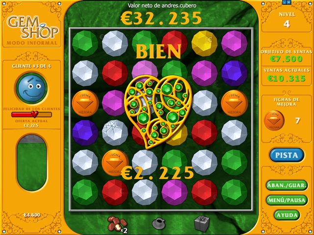 ¡Combina gemas de colores y ten a tus clientes satisfechos! ¡Vende piedras preciosas y joyas a tus felices clientes, pero cuidado! Hazles esperar mucho y se quejarán. ¡Tendrás que ofrecerles buenos regalos para tenerles contentos (y hacerte con la venta)! Recuerda: ¡Clientes satisfechos gastán más y hacen de tu tienda un buen negocio! - Gem Shop