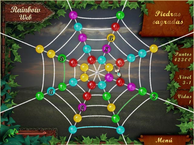 Los abalorios son aleatoriamentes dispersados por una red, está en tus manos ayudar a formar las palabras. Piensa cómo formar líneas de tres o más abalorios del mismo color. Date prisa en formar palabras y salvar el Reino del Arco Iris. - Rainbow Web