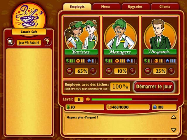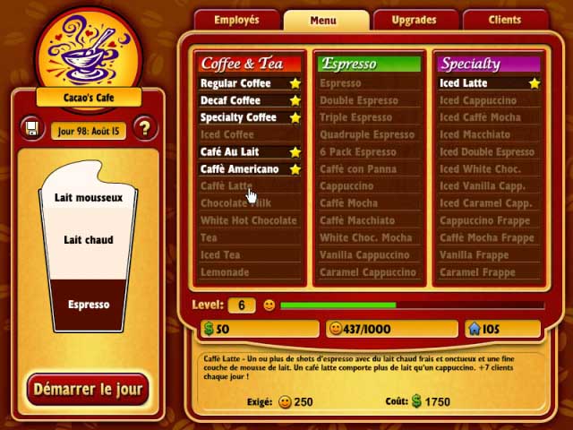 Le magnat du café permet aux joueurs de construire un empire caféiné. En partant d’un seul magasin, le joueur personnalise son commerce en lui donnant un nom et en choisissant un logo et une conception de magasin. De là, il choisit la ville d’où il lancera son empire, New York ou Los Angeles, mais s’il ose vraiment, ce sera la capitale internationale du café : Seattle ! - Coffee Tycoon