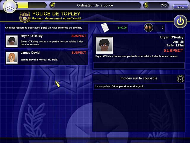 L’absence totale de crimes dans la ville de Topley rend les statistiques d’arrestations de la police municipale quelque peu... embarrassantes. Le maire de Topley, ainsi que le chef de la police, ont décidé d’unir leurs forces pour faire appliquer des lois désuètes et peu connues. En tant que nouvelle recrue, vous allez devoir appréhender et mettre hors d’état de nuire un nouveau genre de criminels grâce à une panoplie de bonus pour espérer obtenir des promotions bien méritées et monter en grade. - Crime Solitaire