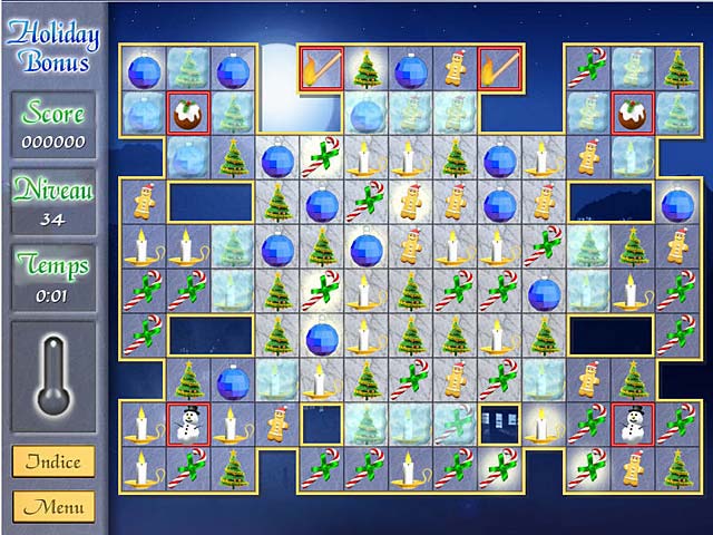 Découvrez le contenu de la hotte du Père Noël juste à temps pour les fêtes dans ce jeu de Match 3 de saison regorgeant de bonus ! Franchissez les niveaux colorés sur des fonds hivernaux, et obtenez des bonus festifs pour progresser et gagner des fonds d’écran de scènes enneigées. Profitez d’une atmosphère chaleureuse au pied du sapin dans ce jeu de Match 3 familial avec Holiday Bonus ! - Holiday Bonus