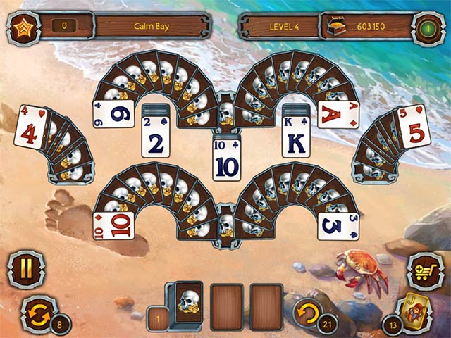 Faites des paires de cartes et profitez d'une ambiance de piraterie. Découvrez toutes les cartes jaunes pour gagner un maximum de pièces. Celles-ci vous permettent d'investir dans la boutique et d'avancer dans les niveaux. Êtes-vous prêt pour l'abordage moussaillon ? - Solitaire Pirate 3