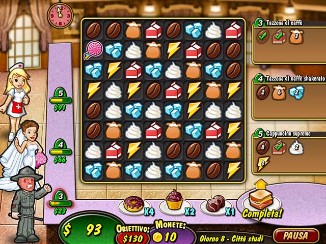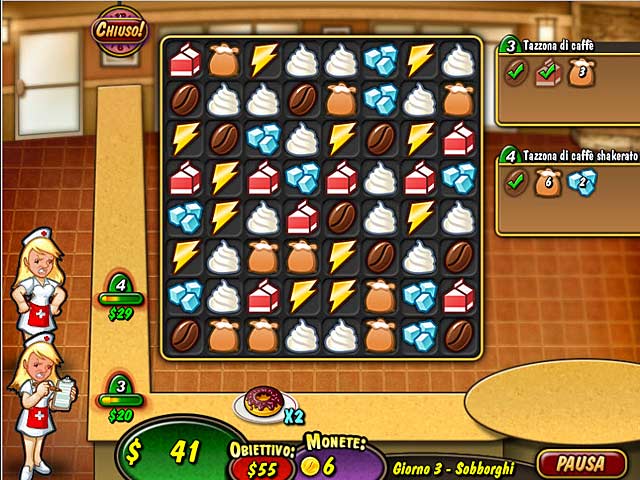Sconfiggi Ciminiera in Coffe Rush, un divertente gioco ad abbinamenti a 3! La caffetteria Smokestack sta inquinando il paese con il suo caffè di scarsa qualità! Apri il tuo bar e conquista i clienti grazie alla qualità del caffè che offri. Affronta la sfida dei molti locali, ciascuno con propri clienti e richieste da soddisfare. Ammoderna il bar, migliora le ricette, prepara prelibatezze e guadagna i bonus! - Coffee Rush