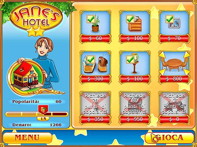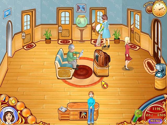 Aiuta Jane a realizzare il suo sogno: costruire un bellissimo hotel a 5 stelle! Comincerai con un piccolo hotel a 2 stelle nella periferia della città, ma potrai raggiungere l'olimpo degli albergatori migliorando le stanze e creandoti un'eccellente reputazione. Tieni d'occhio l'umore dei clienti e rallegrali con ambienti eleganti, servendo bevande e cibi squisiti o semplicemente pulendo le loro stanze. - Jane's Hotel
