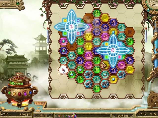舞台は長い歴史を持つ中国。ブロックをマッチさせながら宝石を集めよう!爆弾やハンマーなどをマッチさせ、ブロックに埋まった宝石をすべて集めよう。各地に伝わる伝説や神話についても学べるクエストモードの他に、じーっくり考えて攻略するパズルモードと、ジャンケンルールでマッチさせて行くアドオンモードもあります。 - 古代のワンダーランド