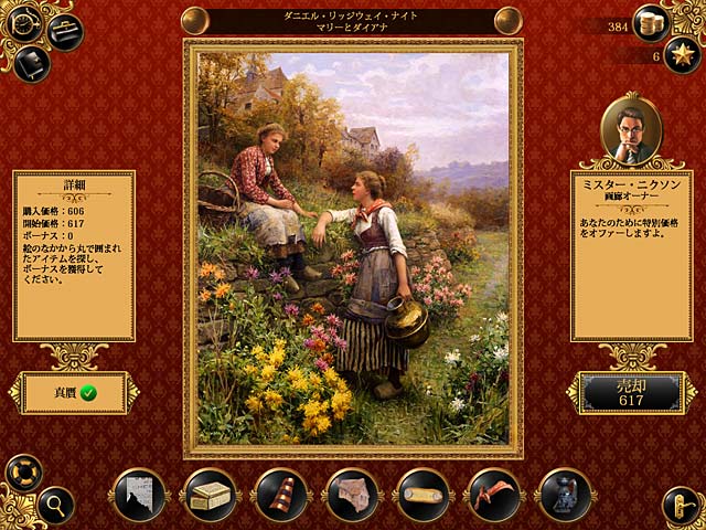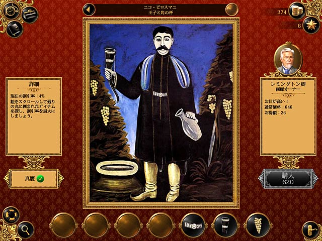 PC ダウンロードゲーム:戦略系ゲーム 英語版タイトル: Art Mogul 今すぐ「アート・モーグル」をプレイ!まずは無料体験版をダウンロードしよう。 美術品売買の世界へと足を踏み入れるチャンス!キミは新米美術品バイヤーとして世界各地の大都市に飛びまわることになる。地元の画廊やカフェ、オークションハウスをめぐってお気に入りの絵画を見つけよう。エキサイティングなオークションで競争相手を退けて名画をゲットするもよし。カフェでニセモノを売りさばいてスリリングな取引を楽しむのもよし。コレクション集めに没頭するのもよし。モネ、ルノワール、セザンヌ…実在する画家の名画が多数登場。色々な楽しみ方ができる「アート・モーグル」でニセモノと本物を見分ける目を養いながらソフィスティケートな気分を味わおう。今すぐ無料体験版をプレイするか完全版をダウンロード! - アート・モーグル