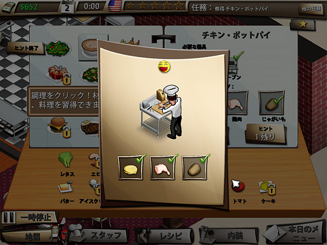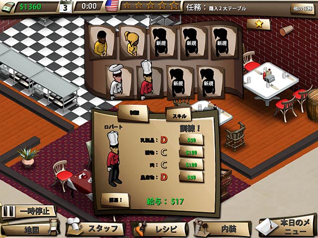 PC ダウンロードゲーム:タイムマネージメント 超一流レストランを作るにはまオープン前の戦略タイムが肝心!シェフやウエイターを雇い彼らをトレーニングしてスキルアップ!新しい料理のレシピを覚えたりシェフの能力に合わせて作ってもらう料理を決めて万全の準備を整えたらレストランをオープン!あとはシェフやウエイターが大活躍してお客を満足させてお金をがっつりと稼いでくれますよ!稼いだお金を投資すればあなたのレストランはどんどんアップグレード!店内を豪華に装飾すればお客の気分も上々です!最高の味とサービスを提供する超一流レストランのオーナーになりましょう! - ビストロ ストリート