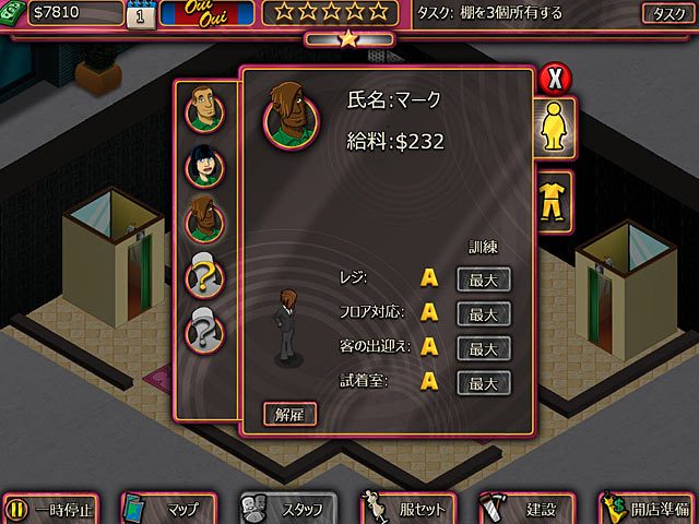 PC ダウンロードゲーム:タイムマネージメントゲーム 英語版タイトル:Boutique Boulevard 今すぐ「ブティック ブールバード」をプレイ! まずは無料体験版をダウンロードしよう。 かつては大人気のブティックが軒を連ねていたファッション通りブティックブールバード。しかし昨今の経済悪化のために通りはすっかり廃れてしまった…そこで通りの再建のために雇われたのはアナタ!さまざまな洋服アイテムを組み合わせてお客様のテイストに合った服セットを作りお客様を呼び込もう。100 以上のデコレーションアイテムの中から自分の好みのものを選んでお店の魅力をアップ!果たしてアナタは高級ブティックからオタクファッションまで何でもそろうブティックブールバードにかつての活気を取り戻すことができるのか?今すぐ「ブティックブールバード」の無料体験版か完全版をダウンロードしてファッション帝国の再建をはじめよう! - ブティック ブールバード