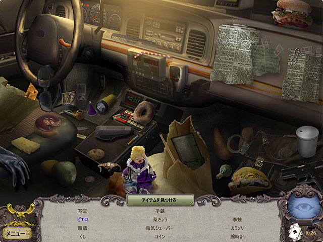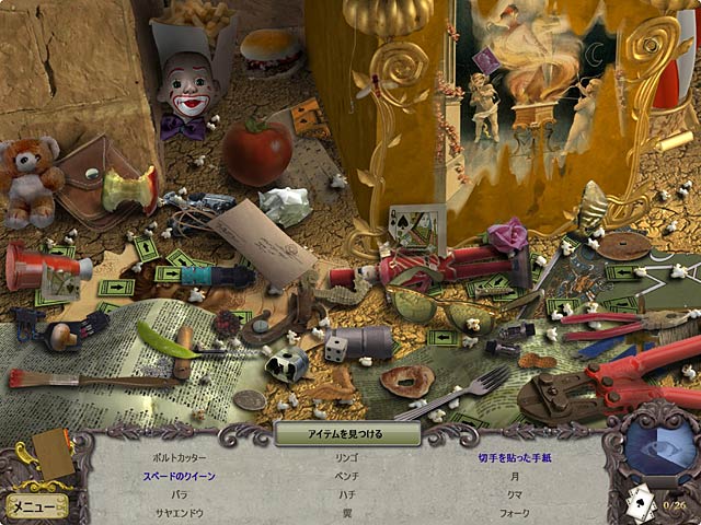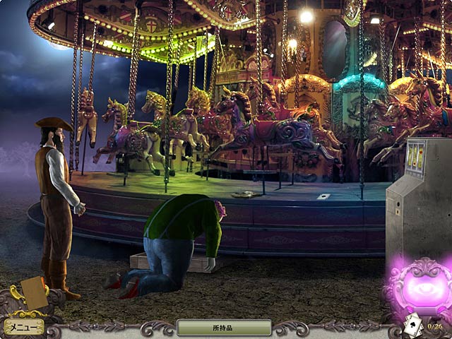 PC ダウンロードゲーム:アイテム探し ゲーム 英語版タイトル:Clairvoyant: The Magician Mystery 今すぐ「クレアボイアント:マジシャン失踪事件」をプレイ! まずは無料体験版をダウンロードしよう。 カーニバルのマジシャンが最後のパフォーマンスのあと行方不明に!キミは透視という特殊な能力を持つ刑事としてこの不可解な事件の謎を解くため、夜の人気のないカーニバルにやってきた。ピエロや女道化師のハーレクイン、海賊、そして4本の腕を持つ男など、個性的なカーニバルの出演者たちに聞き込み調査を行うが、それぞれにどことなく疑わしい。そして捜査をすすめるうち、今回のマジシャン失踪事件と先日発生した銀行強盗事件の関連が浮かび上がる。複雑なアイテム探し場面や巧みなカーニバルゲームをプレイしながら、キミの透視能力を活かして事件の真相に迫ろう!無料体験版で「クレアボイアント:マジシャン失踪事件」をプレイするか、完全版をダウンロードして事件の捜査に乗りだそう! - クレアボイアント:マジシャン失踪事件
