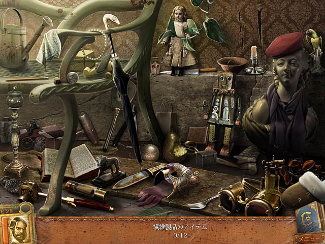 PC ダウンロードゲーム:アイテム探しゲーム 英語版タイトル:Fantastic Creations:House of Brass 今すぐ「ファンタスティック・クリエーション:真鍮の屋敷」をプレイ! まずは無料体験版をダウンロードしよう。 小さい頃母親から聞かされてきた、奇妙な発明品があふれる「真鍮の屋敷」の不思議な物語。その場所が実在することを突き止めた主人公はその屋敷に向かった。ドアの暗号コードを入力すると突然、地面に穴が開き地下深くに落下してしまった!屋敷の主でもある発明家コグルトープ教授の声を頼りに無事地上に戻ることができるのか?行く手を阻もうとするコグルトープ教授が発明したロボットにも負けず一階ずつ最上階に近づこう。今すぐ「ファンタスティック・クリエーション:真鍮の屋敷」の 無料体験版か完全版をダウンロードして屋敷と教授の秘密を暴こう! - ファンタスティック・クリエーション:真鍮の屋敷