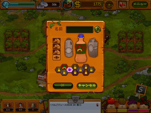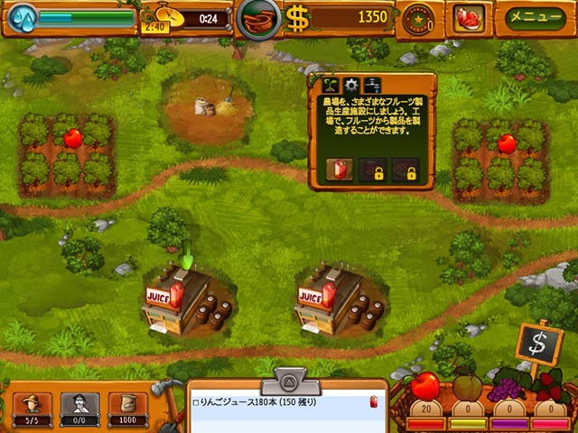 PC ダウンロードゲーム:タイム マネージメントゲーム 英語版タイトル:Fruits Inc. 今すぐ「フルーツインク」をプレイ! まずは無料体験版をダウンロードしよう。 ビジネススクールの学生だったブルックの元に、運命を変える手紙がおばあちゃんから届いた。家族で経営している小さな農場の経営をブルックに任せたいということだった!無事に学校を卒業し、いよいよ農場経営に乗り出したブルック。フルーツインクをジュースのブランドとして発展させ、自然に優しい商品を開発し、チャリティにジュースを寄付することで社会貢献をしてビジネスセンスを磨こう!無料体験版で「フルーツインク」をプレイするか完全版をダウンロードしてフルーツインクを町一番、州一番の規模にしよう! - フルーツインク