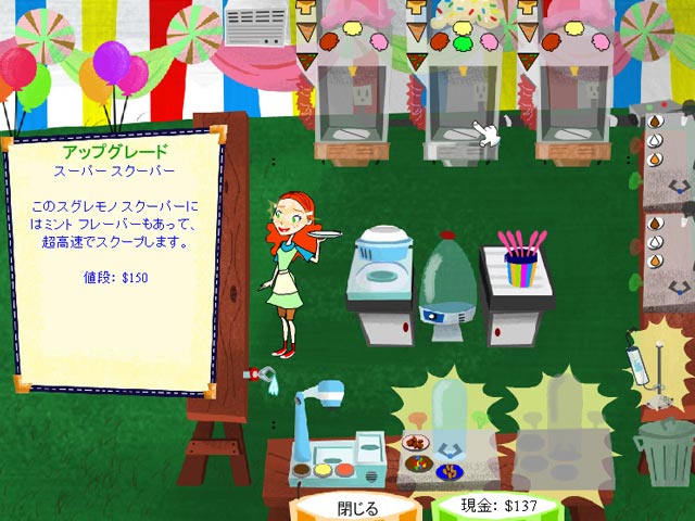 「アイス屋さんになって一日中アイスを食べまくる!」なんて夢見た頃がなつかしい?大人も子供も大好きなアイスクリームを作って売って、主人公のディーと共にアイスクリームトラック「チルモービル号」を立派なアイスクリームパーラーに仕立て上げよう。ディーの目標はおばあちゃんが経営する町一番のアイスクリーム屋「スクープ」を譲り受けること。そのためにも何としても後継者としての才能を証明しなくちゃ!やってくる変わったお客さんを相手に目指せ、「アイスクリームクイーン」! - アイスクリーム・ディ ライツ