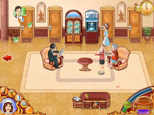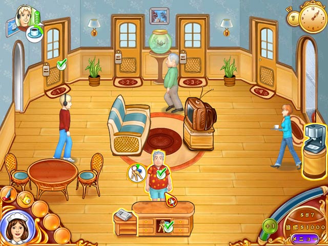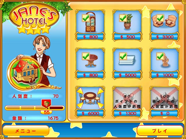 「おばあちゃんの夢を叶えてみせるわ!」そう張り切ってキャリアウーマン、ジェーンが始めたのはホテルビジネス!お客さまをお迎えしてコーヒーをいれたら、テレビの電源スイッチまでお世話してあげよう。ジェーンの目標は 5 つ星ホテルに育てあげること!こじんまりとしたホテルをぐんぐん成長させて、豪華ホテルの夢を実現するお手伝いをしてあげよう! - ジェーンズホテル