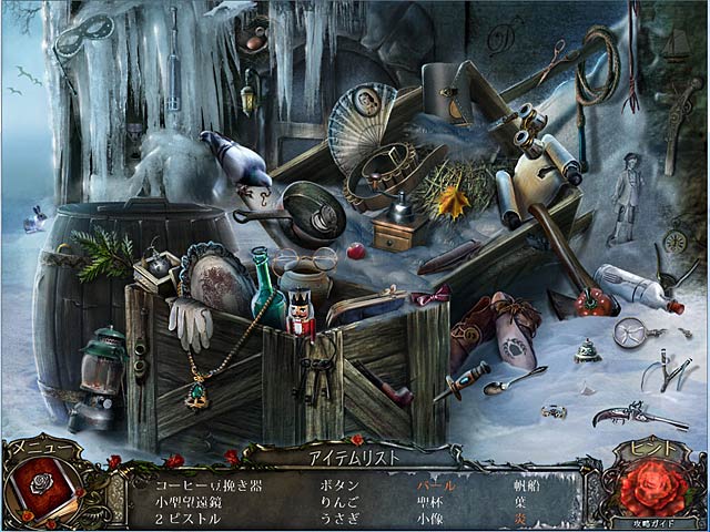 PC ダウンロードゲーム:アイテム探しゲーム 英語版タイトル:Living Legends:Ice Rose Collector's Edition 今すぐ「リビング レジェンド:氷のバラ コレクターズ・エディション」をプレイ! まずは無料体験版をダウンロードしよう。 小説家のエドワードは新しい本を書く資料探しの最中に偶然ローズマウントの町で起きた恐ろしい悲劇の真相を見つけ出した。調査を行なうため彼は一通の手紙と鏡のかけらを恋人のアナタに残し、真夏の吹雪に見舞われてから凍ったままの町ローズマウントへ旅立った。だが数か月たっても未だ戻ってこない。勇気あるアナタは彼を探しに冒険に出る決心をした…。地下洞窟や氷の女王の城でアイテム探しや難解なパズルを解きながらエドワードの足取りをたどり、秘密を握る町の亡霊の声に耳を傾けよう。無料体験版で「リビング レジェンド:氷のバラ コレクターズ・エディション」をプレイするか完全版をダウンロードして、手遅れになる前に愛する恋人や町の人々そしてこの世界を救うことができるだろうか? 当ゲームは特別先行リリースのコレクターズ・エディションです。コレクターズ・エディションをお買い上げの場合、特別ボーナスとしてマンスリー・スタンプカードにスタンプを 3 つ加算させていただきます。また、Game Club クレジット 2 つでコレクターズ・エディションをお買い上げいただけます。 追加コンテンツなど標準版にはない特典が満載! コレクターズ・エディション特典: - リビング レジェンド:氷のバラ コレクターズ・エディション
