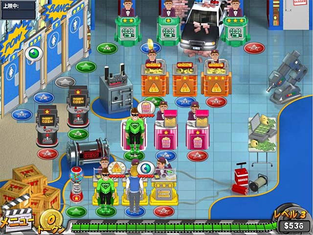前回、あなたの住む町ムービービルの 5 つの歴史的映画館を無事建て直し人気を復活させたきみ。今回はさらなる野望を叶えるためにメガプレックスシアターを SF、アクション、ロマンスなど魅力的な 5 つのテーマシアターに仕上げることに挑戦!競争の激しい映画界ビジネス界の中で勝負するだけでなく、勝ち残れることを世間に証明することができるかな? - メガプレックスマッドネス - 大ヒットオンパレード