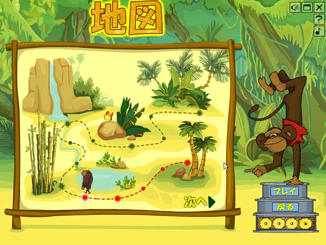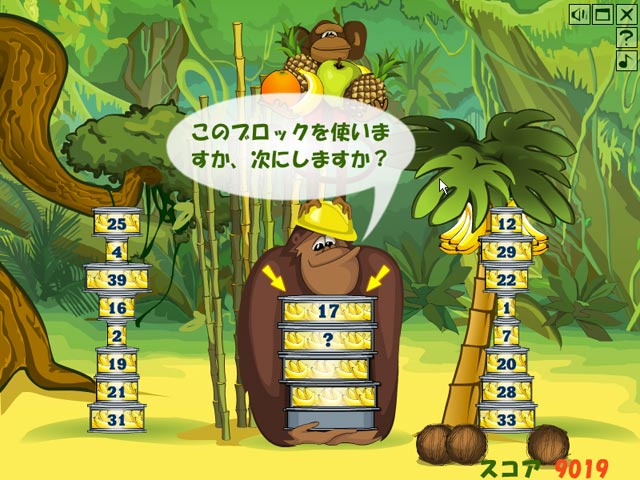 「ゴー・グリーン!」という看板を掲げてエコ活動が重視される今日この頃、ビジネスで儲けようと欲深い人間がジャングルを破壊にやってきた!そこはどっしりと実った美味しい果実に溢れるモンキーたちの楽園。美しい熱帯ジャングルが殺風景な工場地になるのを防ぐためにも、フルーツ缶を積み上げて頭脳勝負だ!誰でも楽しめるシンプルなゲーム、一度始めるとやみつきになっちゃうぞ。 - モンキータワー